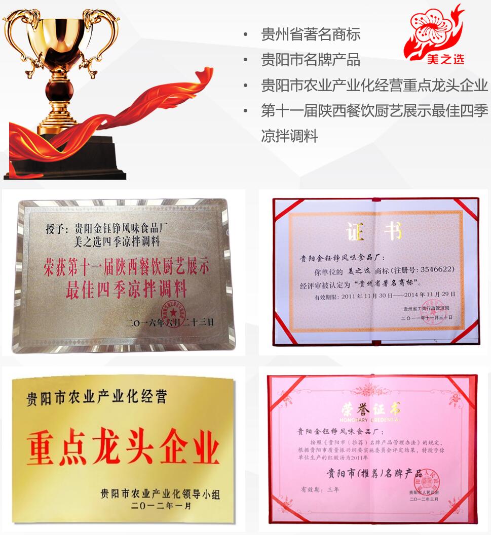 貴州省美之選食品有限公司(貴州省金鈺錚風(fēng)味食品廠)生產(chǎn)產(chǎn)品2012年榮獲貴陽市推薦名牌產(chǎn)品,并且被貴陽市農(nóng)業(yè)產(chǎn)業(yè)化小組評選為重點(diǎn)龍頭企業(yè)。